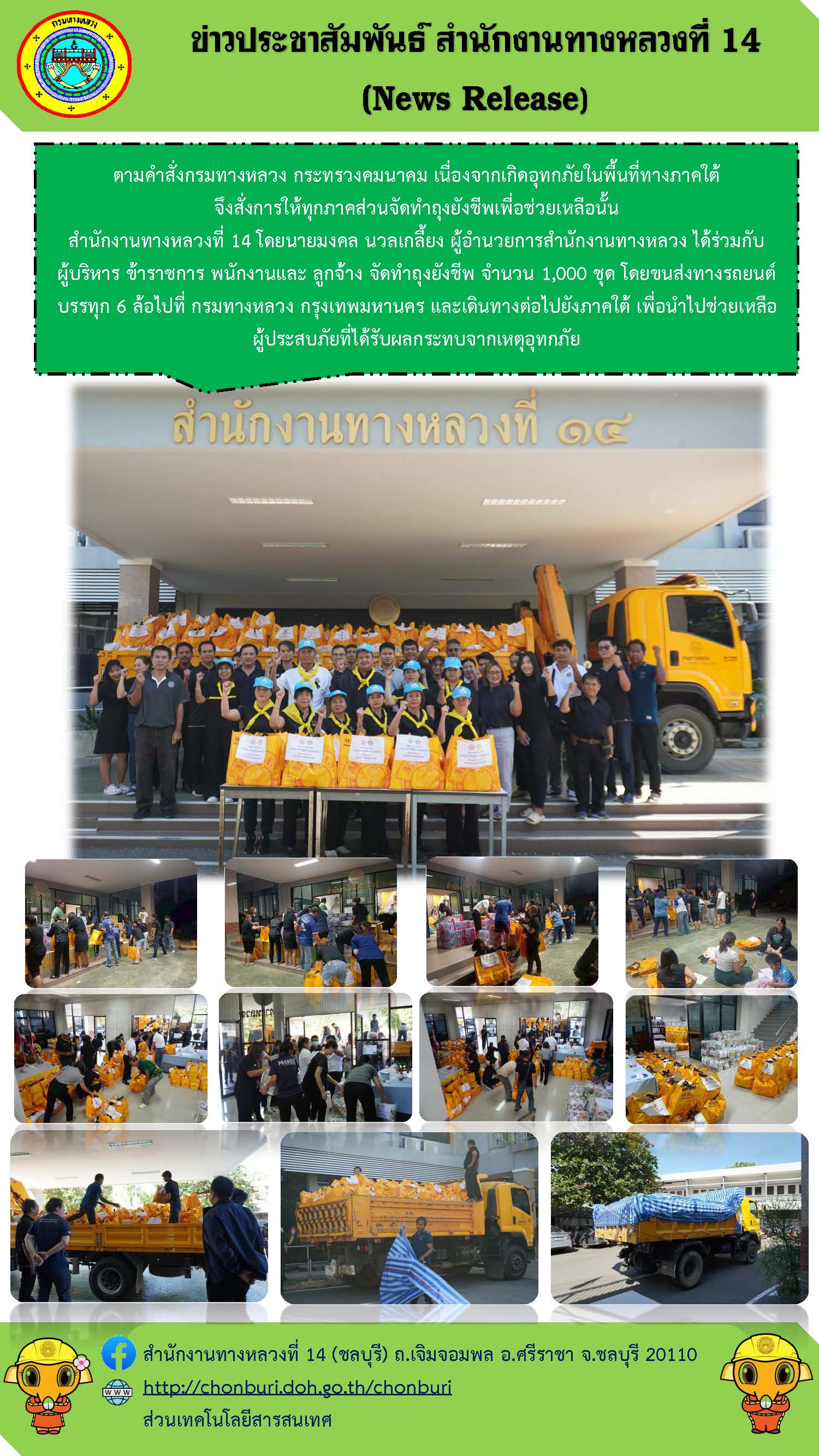 ตามคำสั่งกรมทางหลวง กระทรวงคมนาคม เนื่องจากเกิดอุทกภัยในพื้นที่ทางภาคใต้ จึงสั่งการให้ทุกภาคส่วนจัดทำถุงยังชีพเพื่อช่วยเหลือนั้น